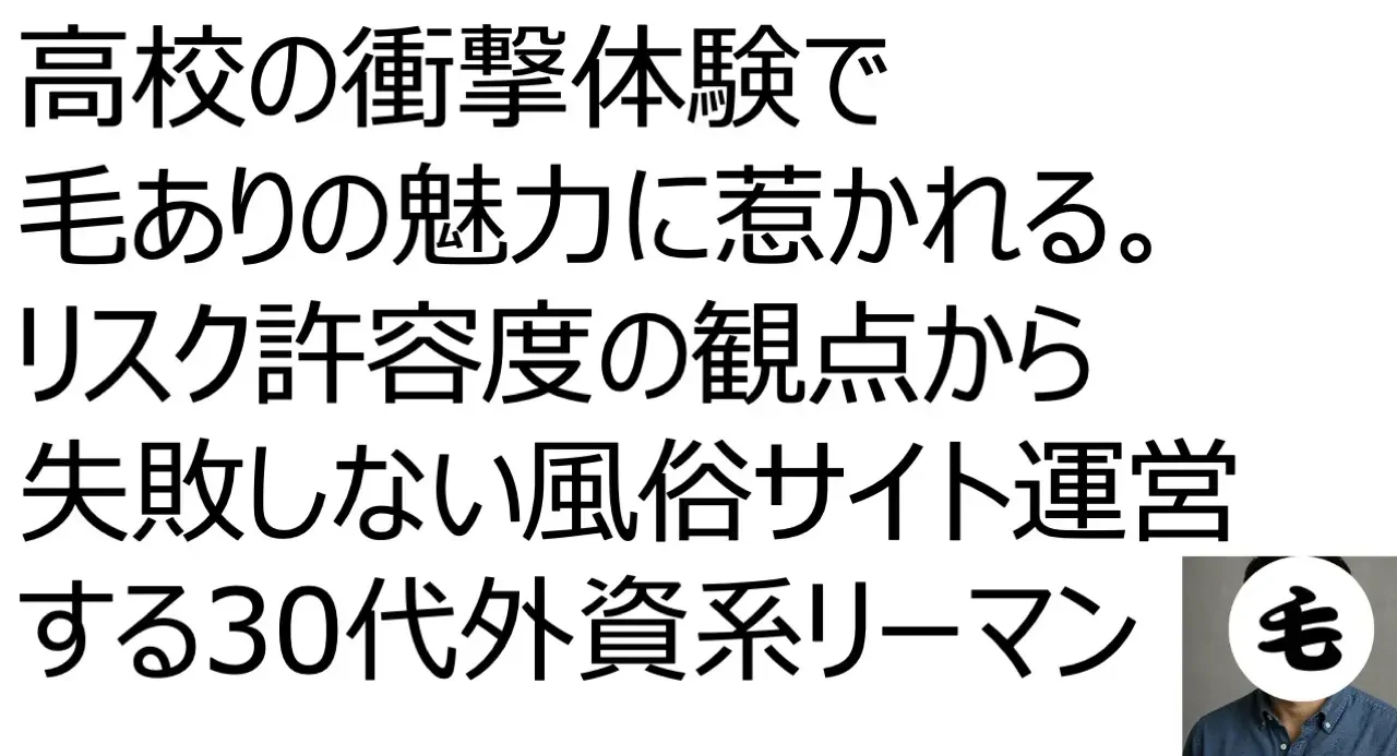 毛好きが転じて、風俗サイトを運営中。毛フェチのためのサイト、しかもクローズドで毛有情報をまとめており、風俗店の失敗をとにかくなくすことに注力しております。サイトはこちらです!